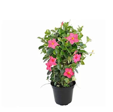 Nas inflorescências, em pequenos rácemos, despontam as belas e chamativas flores em forma de trombeta, enormes em algumas variedades, chegando a 10 centímetros de diâmetro. As flores da Dipladênia geralmente são simples e de coloração rósea com o centro amarelo, mas podem ser dobradas e totalmente rosas, vermelhas ou brancas. Disponível para entrega no Rio de Janeiro, pela Jardineiros.net.